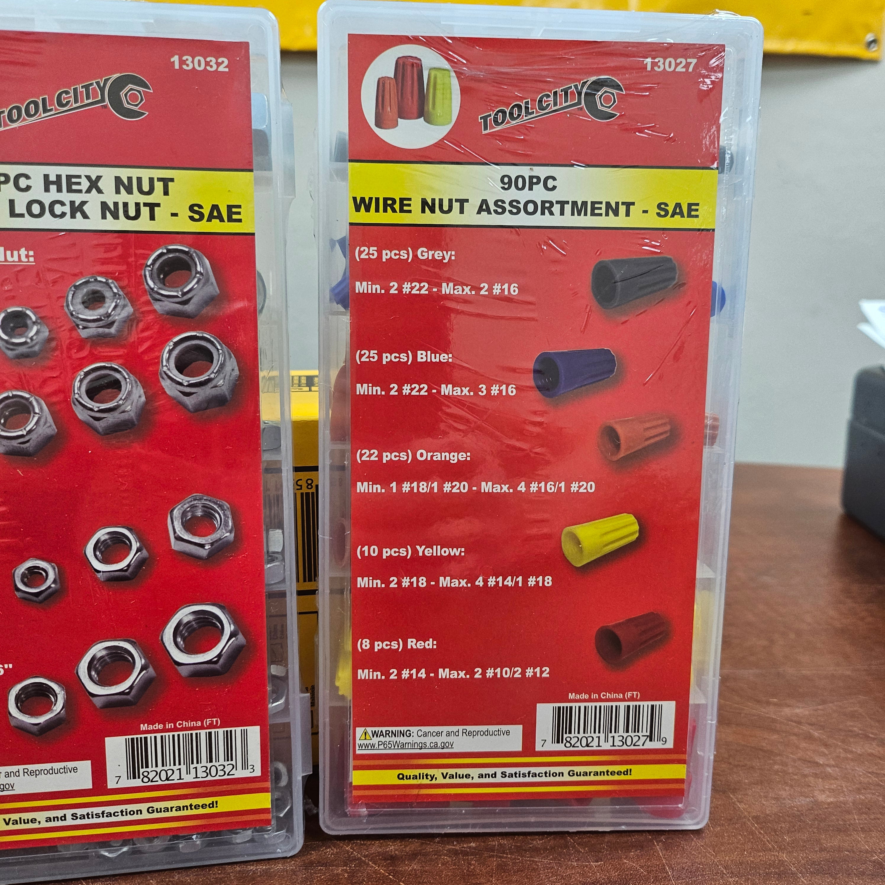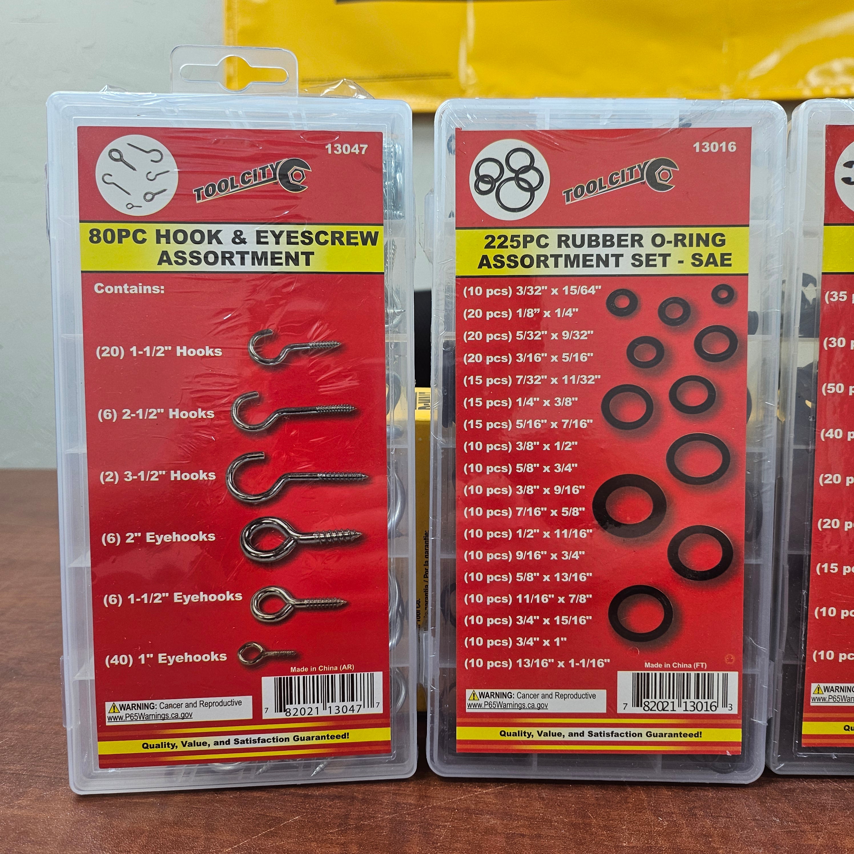 This listing is packed full of "bits and bobs". These items are very convenient for your everyday worker, including accessories like; wire nut assortments, hook and eyescrew assortment, rubber 0-ring assortment, e-clip assortment - SAE, and hex nut and nylon lock nuts!